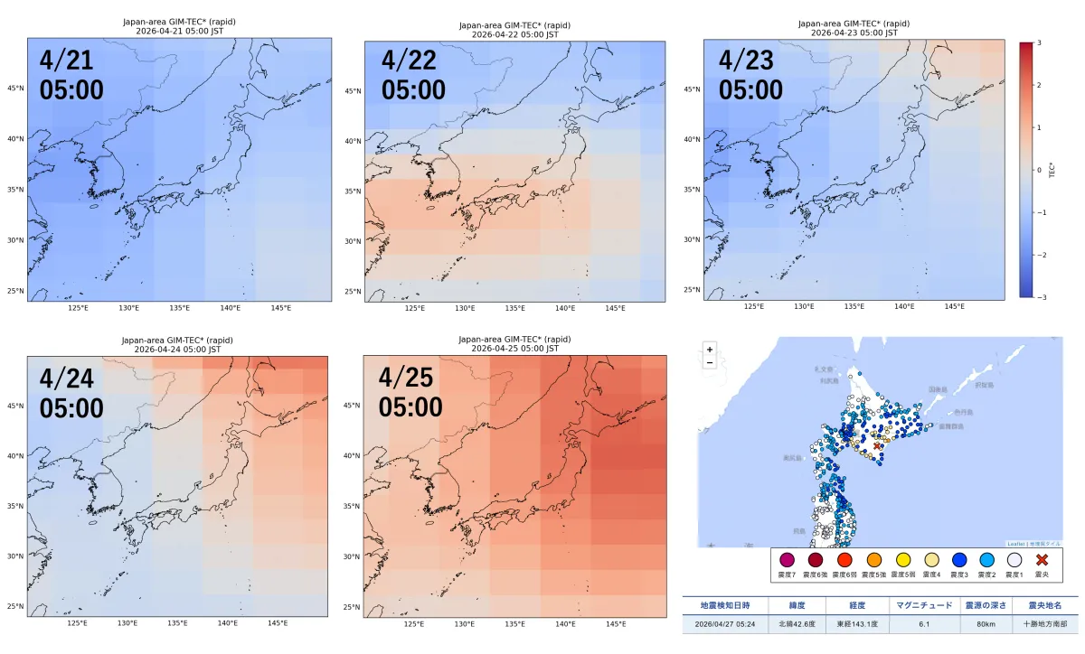 千葉大学に関係する企業、HiSR株式会社の技術には、地震発生2〜3日前に北海道および日本北東部において電離圏電子量の異常な増加が観測されていたというものがあります。これにより、地震前の兆候発現が示唆されています。特に、このときの異常度は3σ近くに達しており、非常に稀な現象であるとされています。