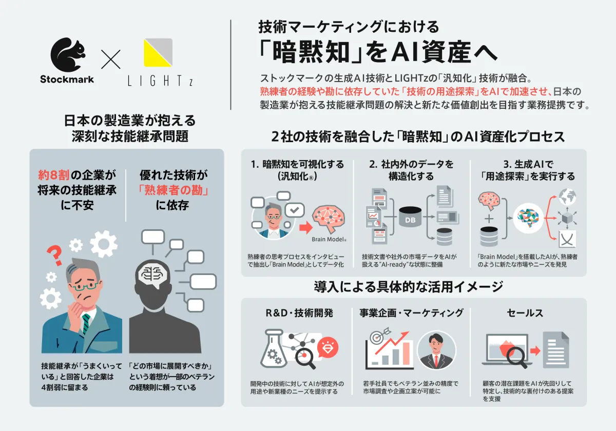 この新たな業務提携は、ストックマークとLIGHTzが協力し、製造業の技術マーケティングや新規用途探索の領域を強化することを目指しています。LIGHTz社が持つ暗黙知の可視化技術と、ストックマークの生成AIプラットフォームを融合させることで、熟練者の知見をAIに実装し、高度な市場開拓を支援するのです。