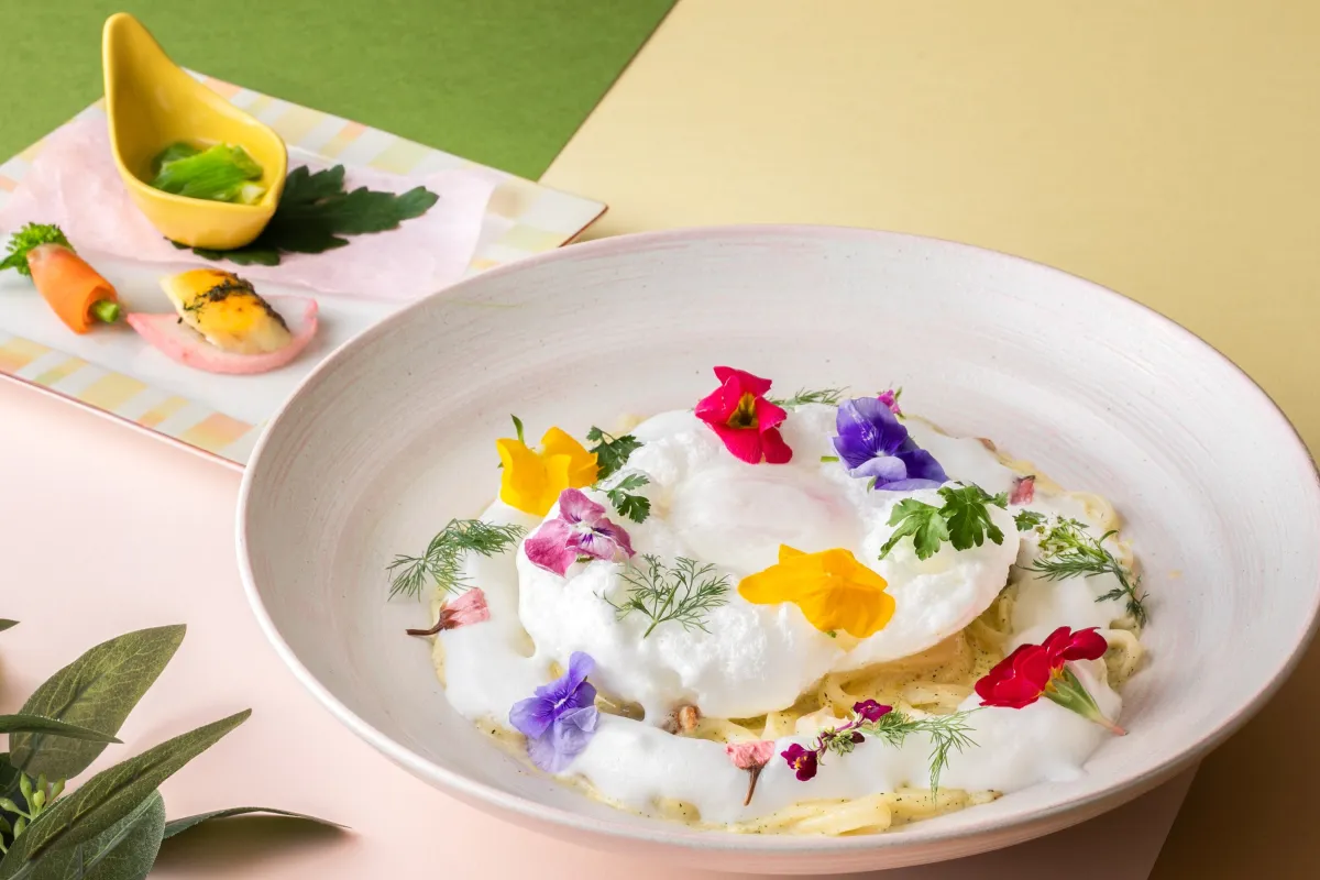 エディブルフラワーをあしらい、まるで春の花畑のように可愛らしさが際立つ一品です。ふわふわのメレンゲととろける温度玉子が加わり、まろやかさを一層引き立てます。