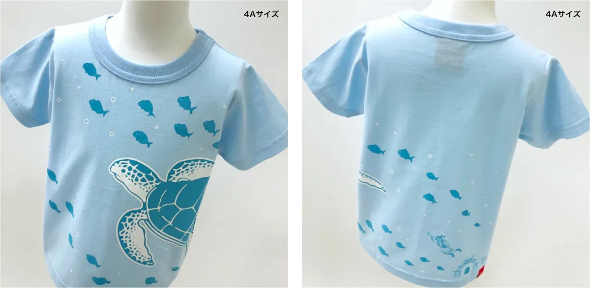 このTシャツは、日本財団が推進する「海と日本プロジェクト・CHANGE FOR THE BLUE」の一環として製作されました。デザインには、心地よさそうに泳ぐウミガメの姿が描かれ、ごみのない美しい海をイメージしています。バックプリントには、豊かな海へ続く竜宮城を連想させる要素が取り入れられ、この未来を私たちの手でつなげていく意義が込められています。