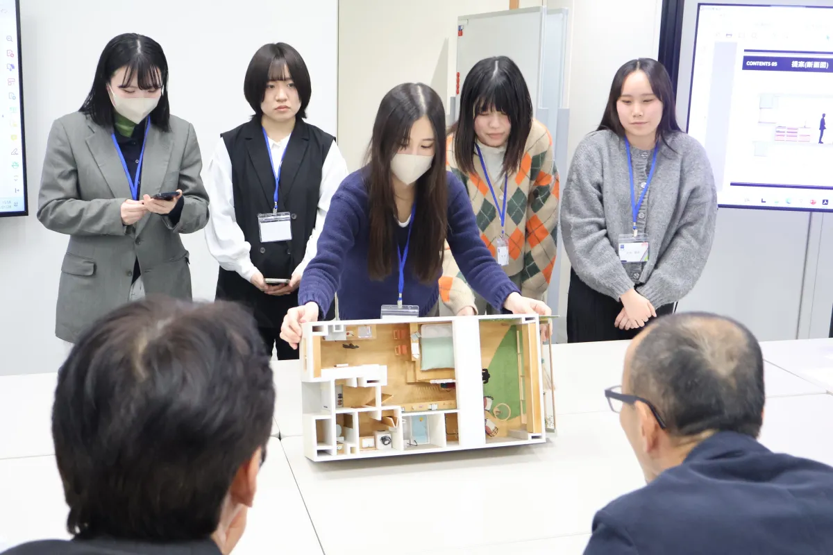 プロジェクトでは学生が三つのグループに分かれ、約半年間の期間をかけて取り組みました。具体的には、現地調査や周辺環境のリサーチを行った後、中間発表でフィードバックを受け、最終的にリノベーション案をプレゼンテーションしました。その際には、パース図や模型を活用し、伊藤忠リート・マネジメントの役員に対して成果を発表しました。