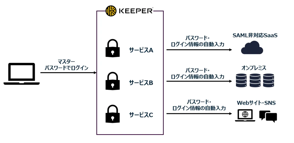 Keeperは、クラウド上のサービスやオンプレミス環境を問わず、全てのパスワードを統一的に管理します。これにより、複雑化した社内環境でも一貫した認証の強化が実現できます。