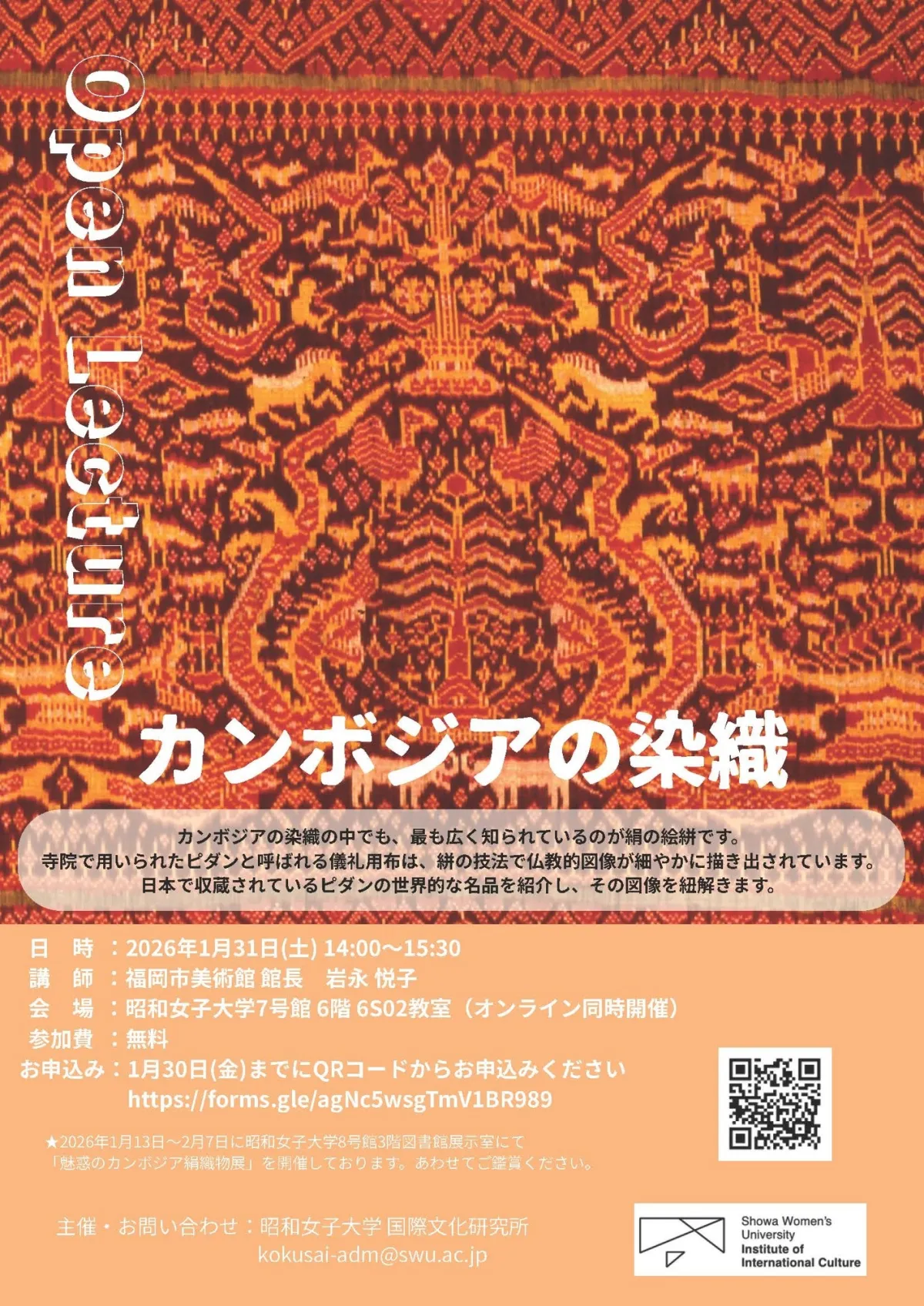 2026年1月31日、昭和女子大学国際文化研究所にて、公開講座『カンボジアの染織』が開催されます。講師には、福岡市美術館館長である岩永悦子氏を迎え、カンボジアの絹の絵絣、特に寺院で用いられる儀礼用布『ピダン』に焦点を当てます。
