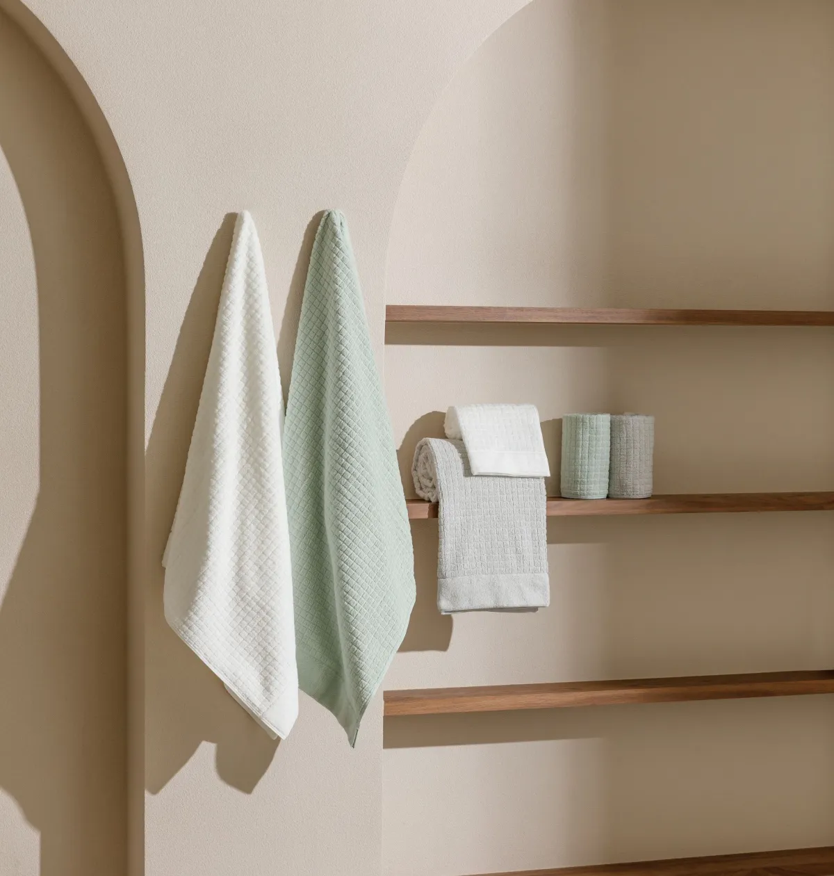 「ヴィラスイート」は、南国のリゾート地を連想させるような軽やかな空気感を再現するために、素材やデザインにこだわり抜いて開発されました。凹凸のある格子パイルが特徴で、この構造が光を受けると美しい陰影を生み出します。このように視覚的にも心地よい印象を与えるだけでなく、触った感触にもリゾートらしさが表現されています。