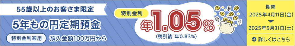 この「アクティブシニア円定期」は、55歳以上の方が対象で、5年間の円定期預金に対して特別金利を提供します。通常金利は年0.50%(税引前)ですが、キャンペーン中はこれに年0.55%が加わった年1.05%(税引後年0.83%)が適用されるというもの。これにより、ネット銀行の中でも最高水準の金利を誇ります。