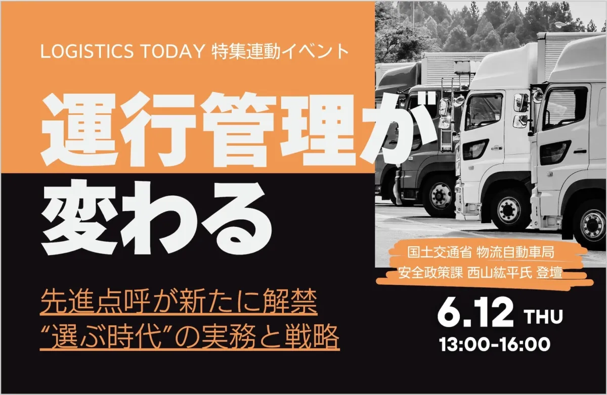2025年を見据えた運行管理の変革をテーマに、LOGISTICS TODAYが主催するセミナー「運行管理が変わる2025──点呼・一元化・現場戦略の分岐点」が、2025年6月12日(木)にオンラインで開催されます。このイベントでは、物流業界における最新の制度進展を解説し、安全と効率の両立を目指す運送事業者に向けた情報提供が行われます。