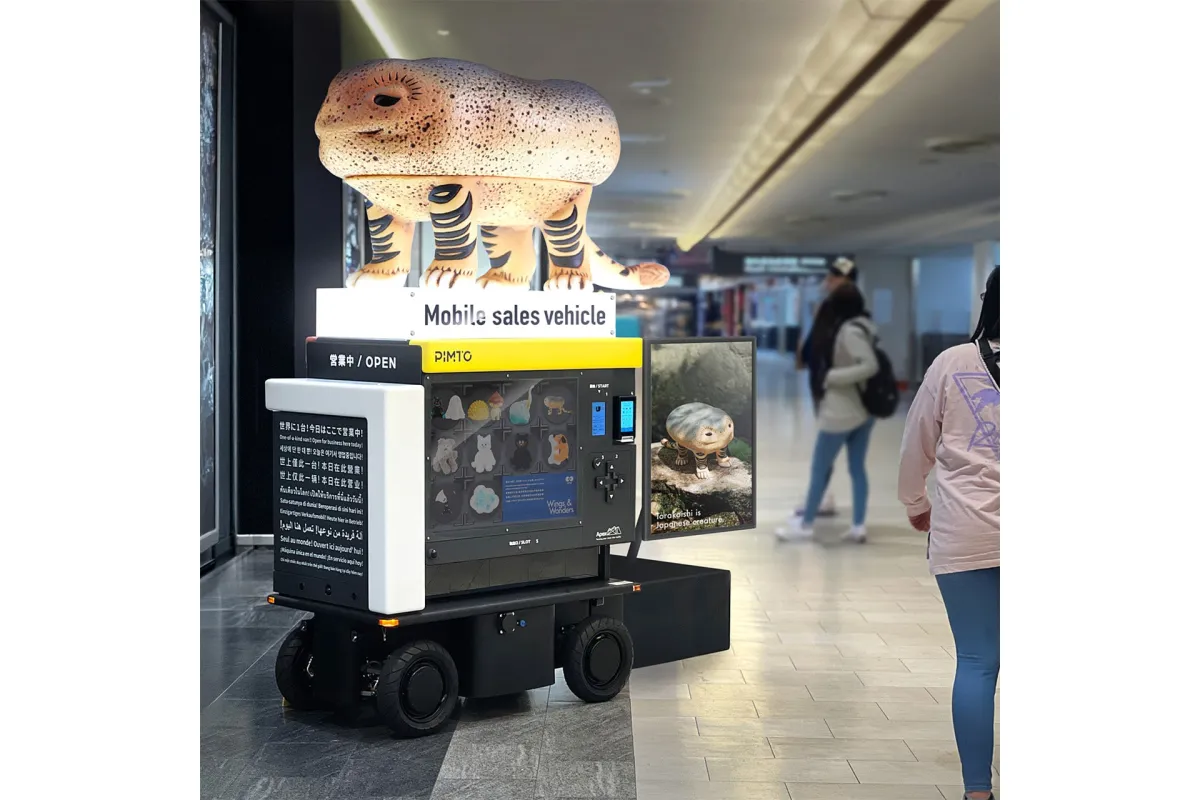 「PIMTO」では、無人販売ロボットが自律的に移動することは必要なく、リモート操縦によって運営されます。これにより、販売場所の人流が多いエリアへ柔軟に移動させることが可能です。また、販売ロボットのデザインも工夫されており、11カ国語で表示される誘引メッセージが、多様な国の顧客を魅了します。