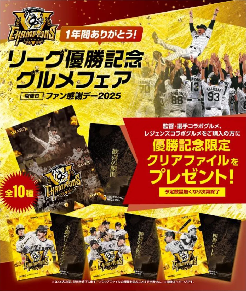 クリアファイルは全10種あり、現役の監督・選手とともに、過去のリーグ優勝時のOBたちの勇姿がデザインされています。これらのクリアファイルは数量限定ですので、お早めにゲットしてください!