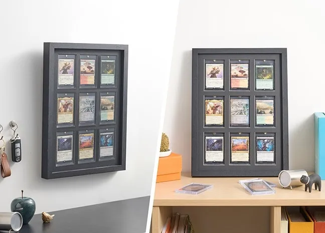 「TCG-01」は、35ptサイズのマグネットローダーにぴったり合うようにデザインされています。外寸は約W73×H110×D7mmで、カードがしっかりと収まります。最大9枚のコレクションを美しく額装でき、まるでアート作品のように飾ることができます。これにより、トレーディングカードが一層引き立ち、お部屋もおしゃれに演出されます。
