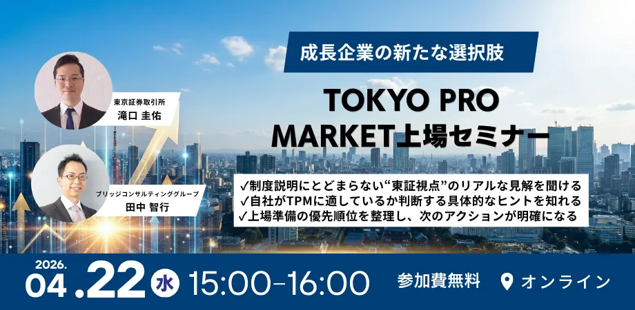 2026年4月22日(水)、ブリッジコンサルティンググループ株式会社が主催する「成長企業の新たな選択肢 TOKYO PRO Market上場セミナー」がオンラインで開催されます。このセミナーでは、TOKYO PRO Market(TPM)という新たな上場機会について、さまざまな視点からの解説が行われる予定です。