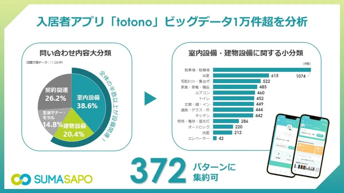 株式会社スマサポ(東京都中央区)は、入居者向けアプリ「totono」に寄せられた11,265件の問い合わせを分析した結果を発表しました。この分析は、全国各地の多様な物件から集まったデータに基づいており、その結果から不動産管理業界における新たな方向性が見えてきました。
