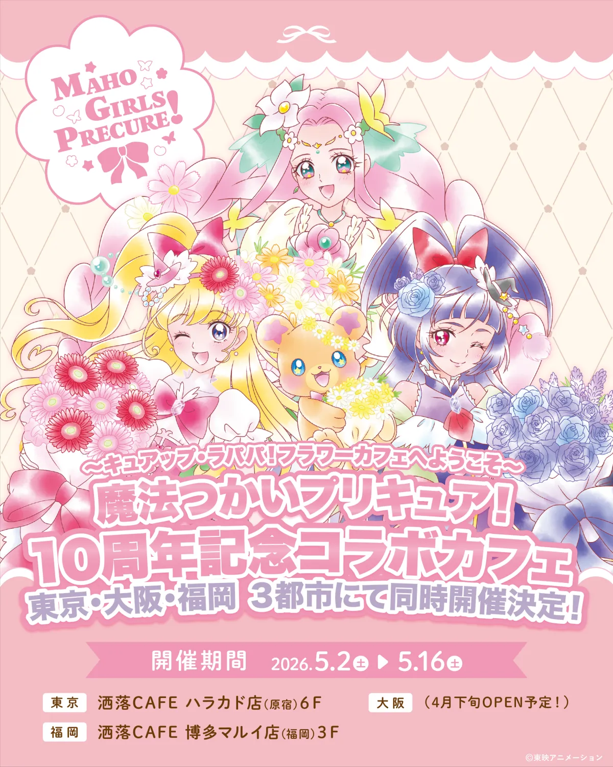 10周年を迎えた「魔法つかいプリキュア!」の記念コラボカフェが、東京・原宿、福岡・博多、新たにオープンする大阪店舗の3都市で同時開催されることが決定しました。イベントは2026年の5月2日から16日までの期間で、特別なオリジナルメニューと共にファンをお迎えします。