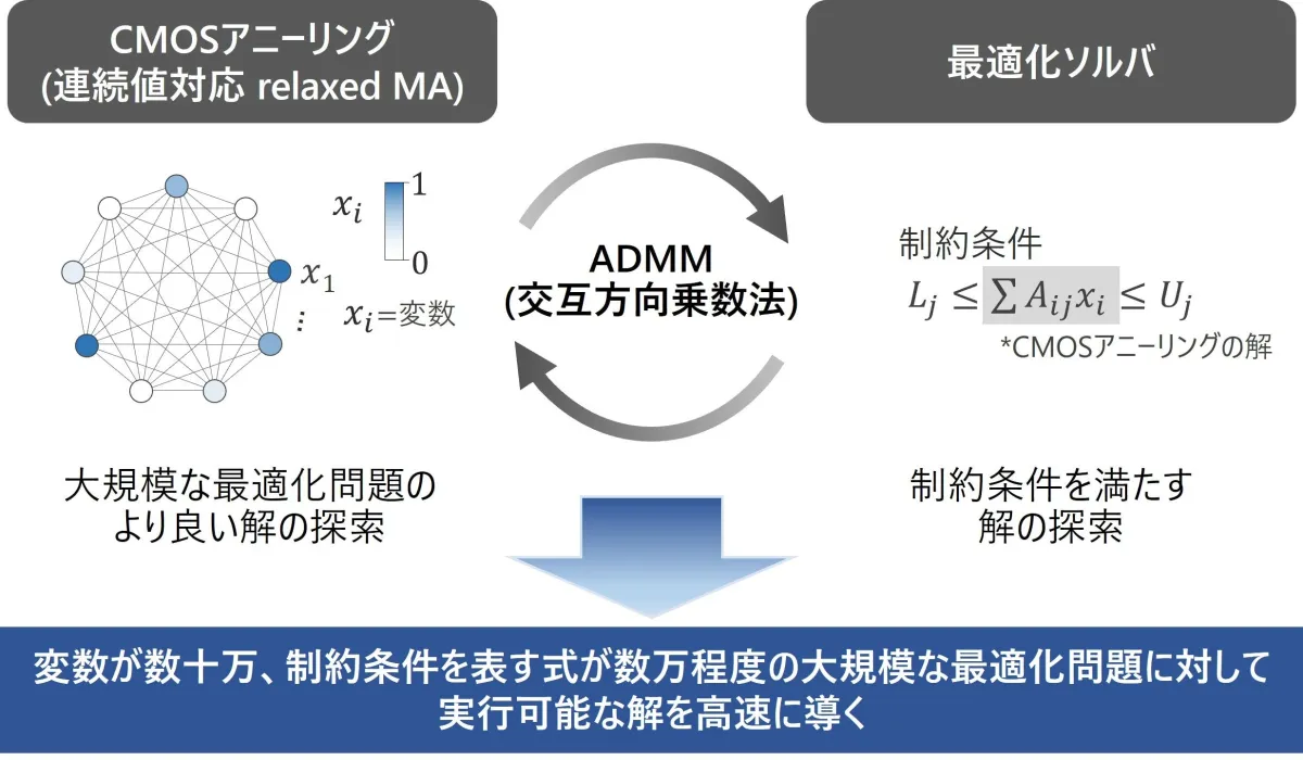 具体的には、CMOSアニーリングが最適化問題の質の高い解を見つけ、その後最適化ソルバが制約条件を満たす解を周辺で探ることを繰り返す仕組みになっている。この方法によって、問題を効率よく分割し、各部分を別々に解決する「交互方向乗数法(ADMM)」というアルゴリズムを採用しているのである。