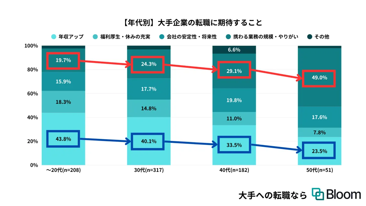 調査結果によると、20代が大手企業への転職活動において最も期待する要素は「年収アップ」であり、43.8%がこの選択肢を選びました。一方で、より年齢が高くなるほど「携わる業務の規模・やりがい」を求める割合が高まるという傾向が見受けられます。全体としては、292名が「年収アップ」を最重要視し、次いで「携わる業務の規模・やりがい」が200人と続いています。