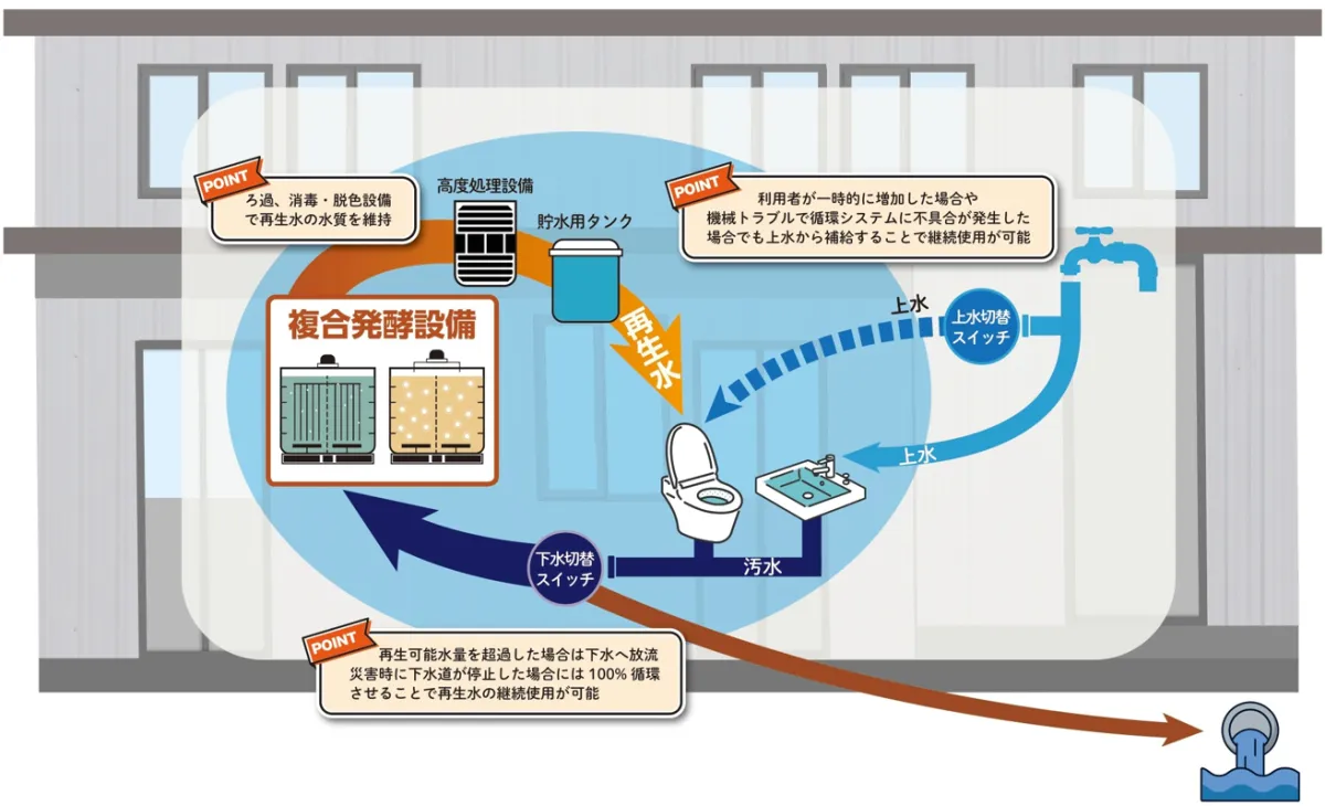 2023年より、沖縄県宮古島市にある東急グループの「まいぱり」施設で実施された実証実験において、安定的な稼働が確認されました。この結果から、都心での水循環システムの稼働も信頼性が高いとされています。このシステムでは、トイレやキッチンから出る汚水を複合発酵技術を用いて浄化し、再利用可能な水として活用します。この方法により、化学薬品を使用せずに微生物の力で水を浄化するため、環境に優しい廃水処理が実現可能です。