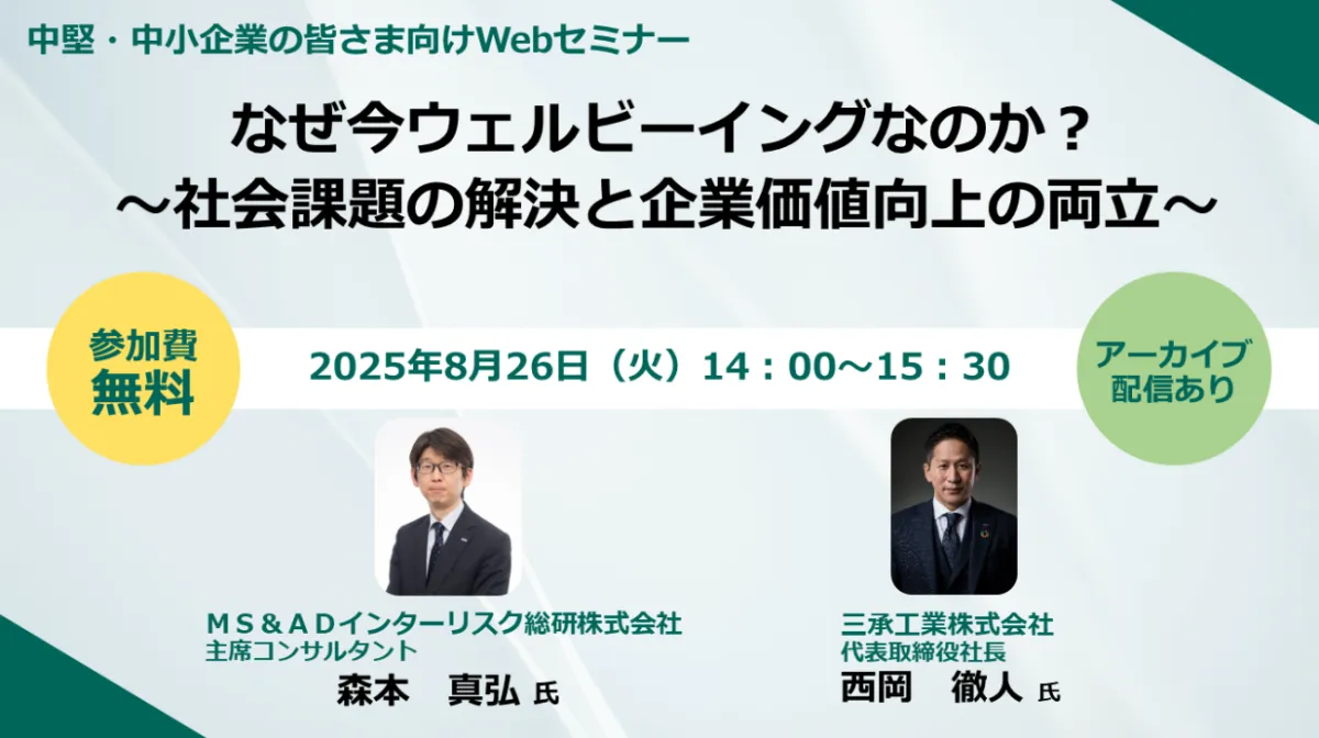 近年、企業経営において「ウェルビーイング」という概念の重要性が高まっています。「ウェルビーイング」とは、身体的、精神的、社会的に満たされている状態を指し、これを持つ従業員は創造性や生産性の向上に寄与することがわかっています。このような背景を踏まえて、三井住友海上火災保険株式会社とMS&ADインターリスク総研株式会社は、8月26日に企業向けにオンラインセミナーを開催します。