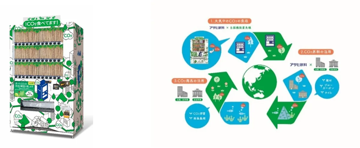 アサヒ飲料の「CO₂を食べる自販機」は、飲み物を提供するだけでなく、大気中のCO₂を吸収する独自の機能を持ちます。この自販機は、利用者に飲み物を提供しつつ、環境保護にも貢献するという新しい形のビジネスモデルを示しています。自販機1台あたりの年間CO₂吸収量は、電力由来のCO₂排出量の最大20%を相殺し、約20本のスギに相当します。このように、アサヒ飲料は持続可能な社会の実現に向けた取り組みを強化しています。