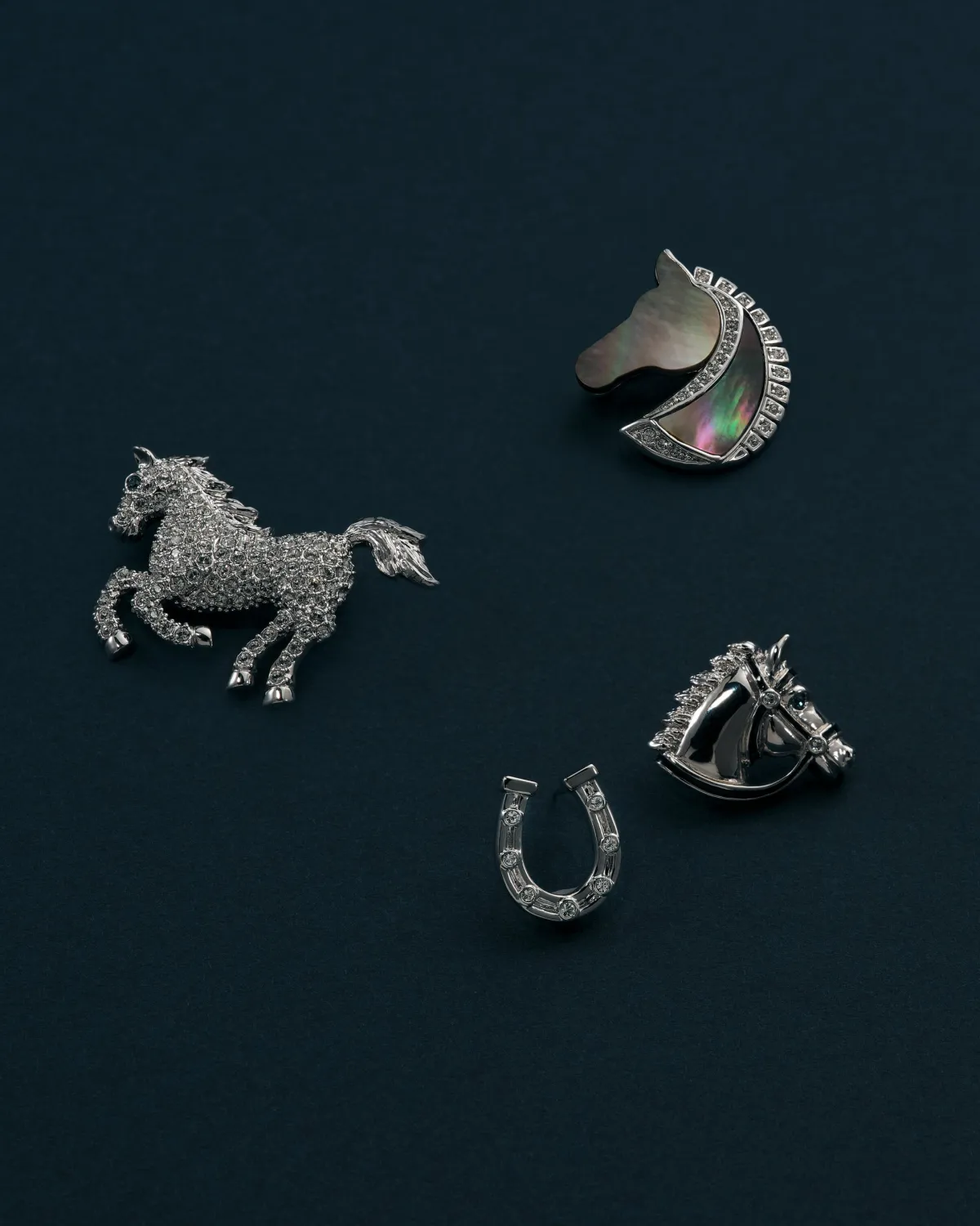 この新しいコレクションには、馬をモチーフにした様々なデザインのブローチやネックレスが含まれます。