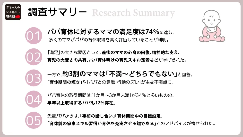 株式会社赤ちゃん本舗の調査機関「赤ちゃんのいる暮らし研究所」は、パパが育休を取った家庭を対象にしたアンケートを実施しました。この調査では、パパ育休の取得によってママがどのように感じているのかを明らかにしています。育休を取得したパパたちとその家庭がどのように育児を実践しているか、また、育休に対する満足度や不満点は何かを探ります。