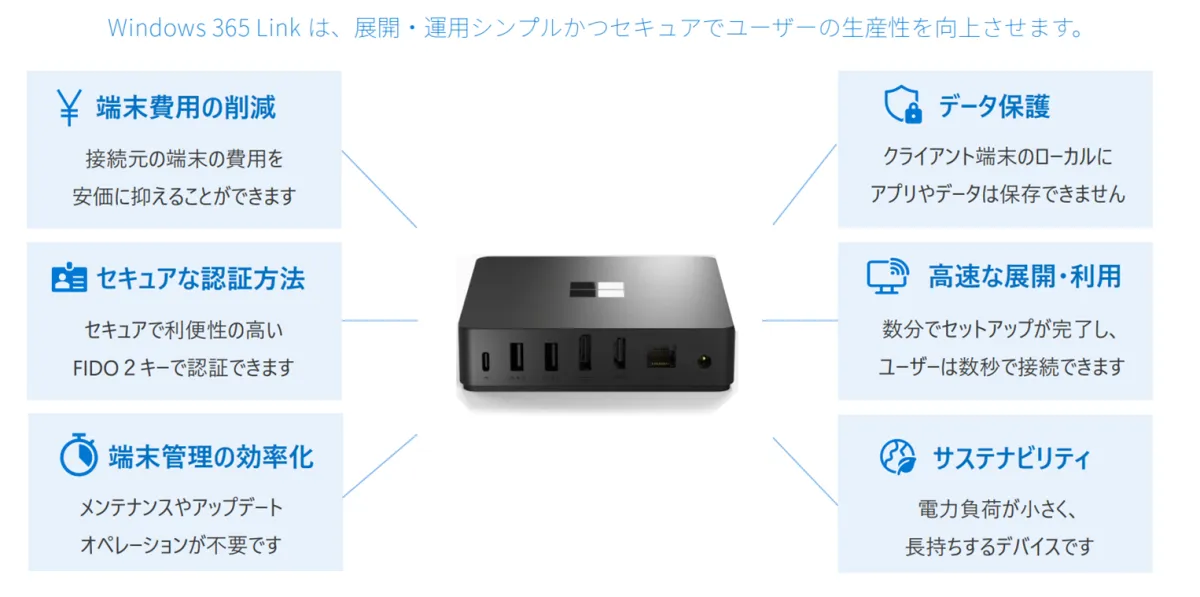 「Windows 365 Link」は、オンプレミス環境とクラウドPCをシームレスに接続する次世代ソリューションです。業務の効率を上げるだけでなく、柔軟な働き方を実現するとともに、IT管理の負担を軽減します。