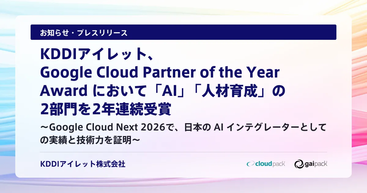 KDDIアイレット株式会社が、ラスベガスで行われた「Google Cloud Next 2026」において「2026 Google Cloud Partner of the Year Award」を受賞しました。この受賞は、AI分野と人材育成の2部門にわたるもので、同社の技術力と人材育成の取り組みが高く評価されてのことです。