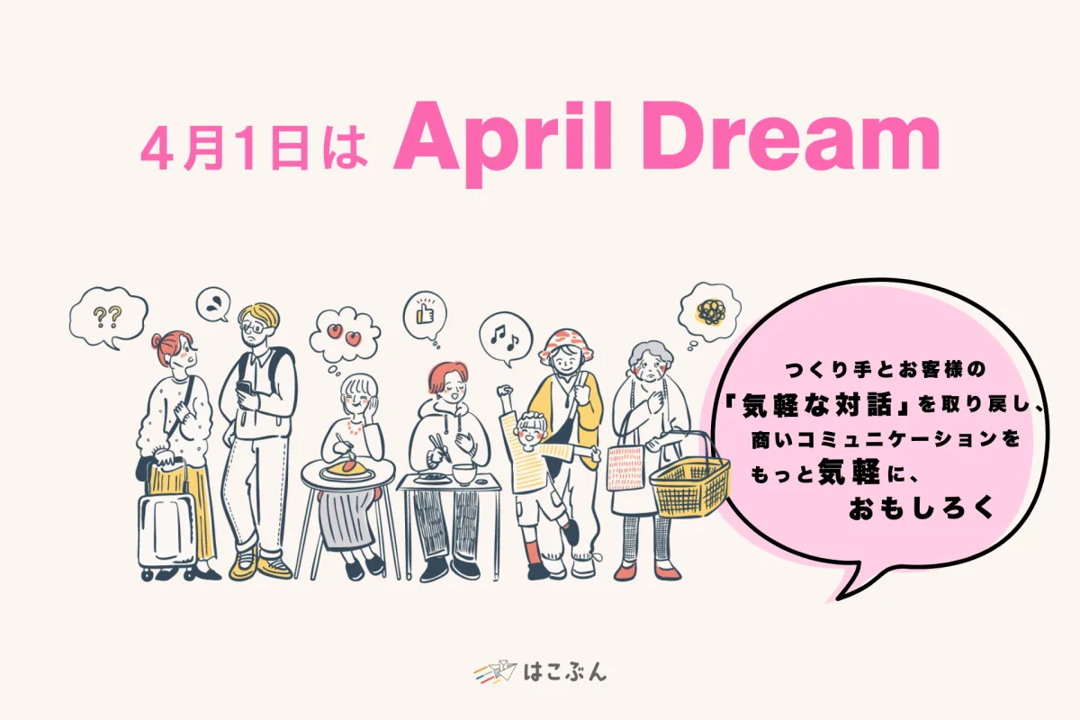 株式会社はこぶんは、4月1日を夢を発信する日として位置づけている「April Dream」に賛同しています。この日を通じて、様々な夢を具現化していく意義を感じながら、ホンネPOSTというツールを通じて、事業者と顧客の新たな対話の場を提供しています。