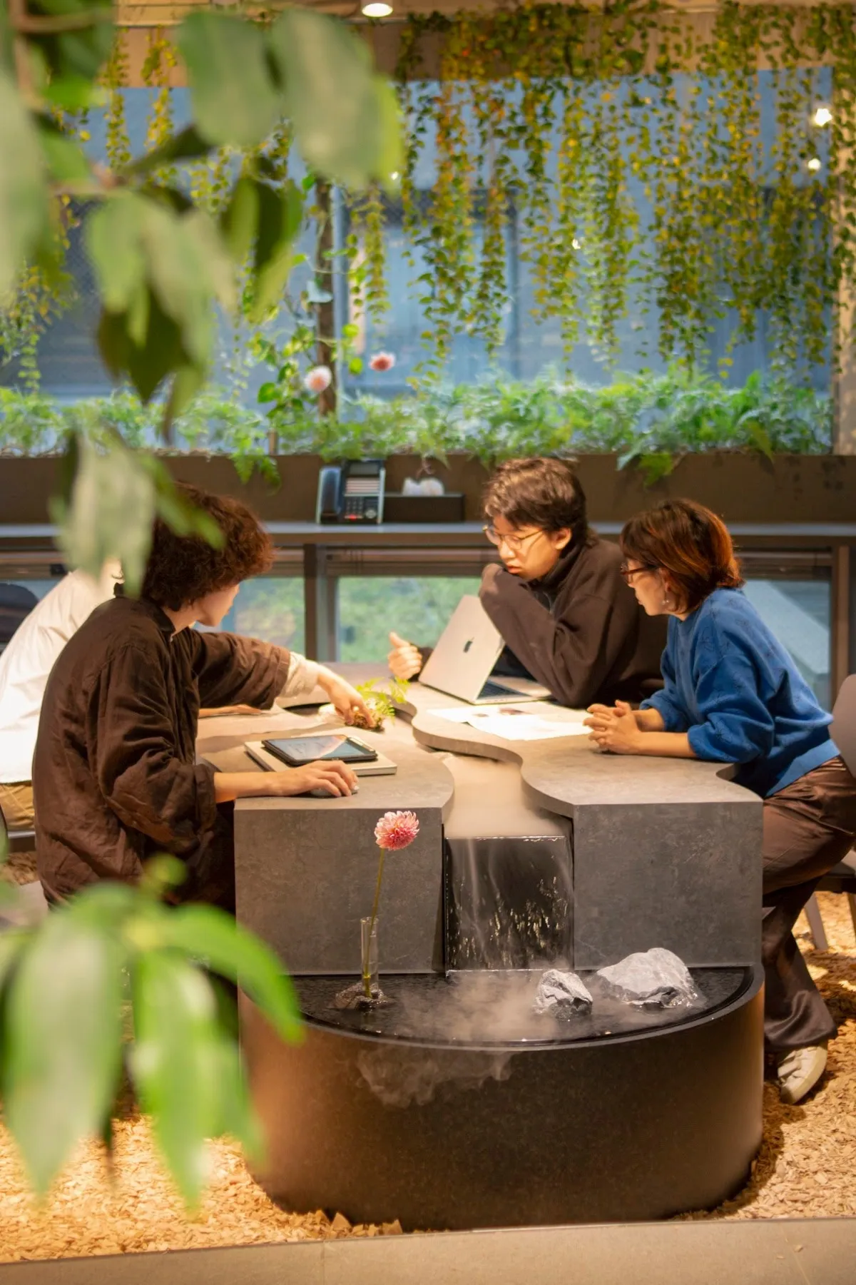 「kasumi」は、テーブルの中央から霧が発生するユニークな仕組みを採用しています。この霧は、焚き火を囲んでいる時のような柔らかな雰囲気を演出し、心を和ませる効果があります。また、霧の噴出はタイマーで管理されており、一定の時間ごとに霧が立ち上ることで、作業や会議中におけるリズムを作る役割も持っています。清らかな水が循環するシステムによって、デザイン性だけでなく、環境への配慮も意識されています。