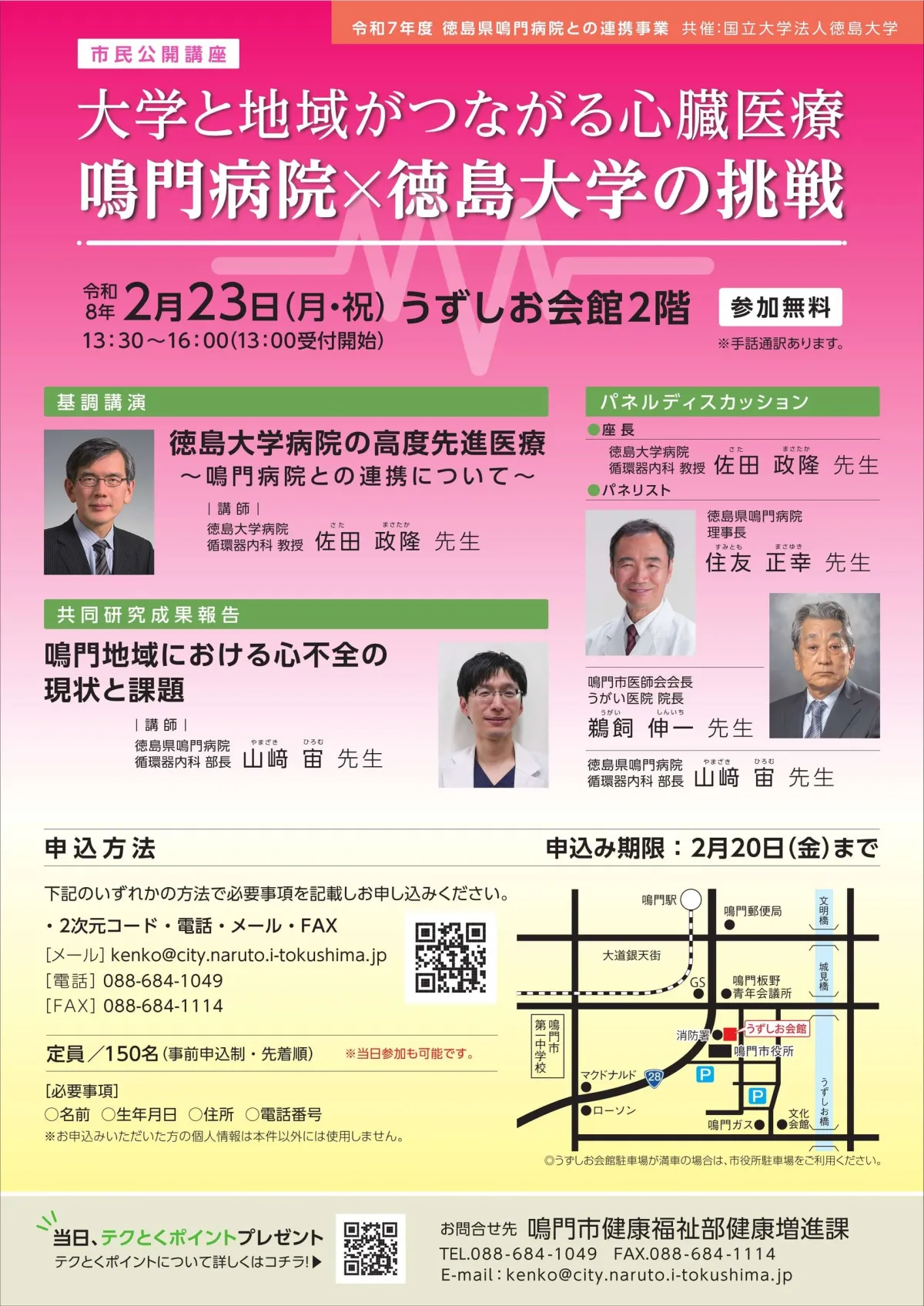 お問い合わせについては、鳴門市役所健康福祉部健康増進課までご連絡ください。電話088-684-1512、またはメールでの連絡も受け付けています。心臓に関する医療の未来を一緒に考えるため、ぜひ皆さんのご参加をお待ちしております!