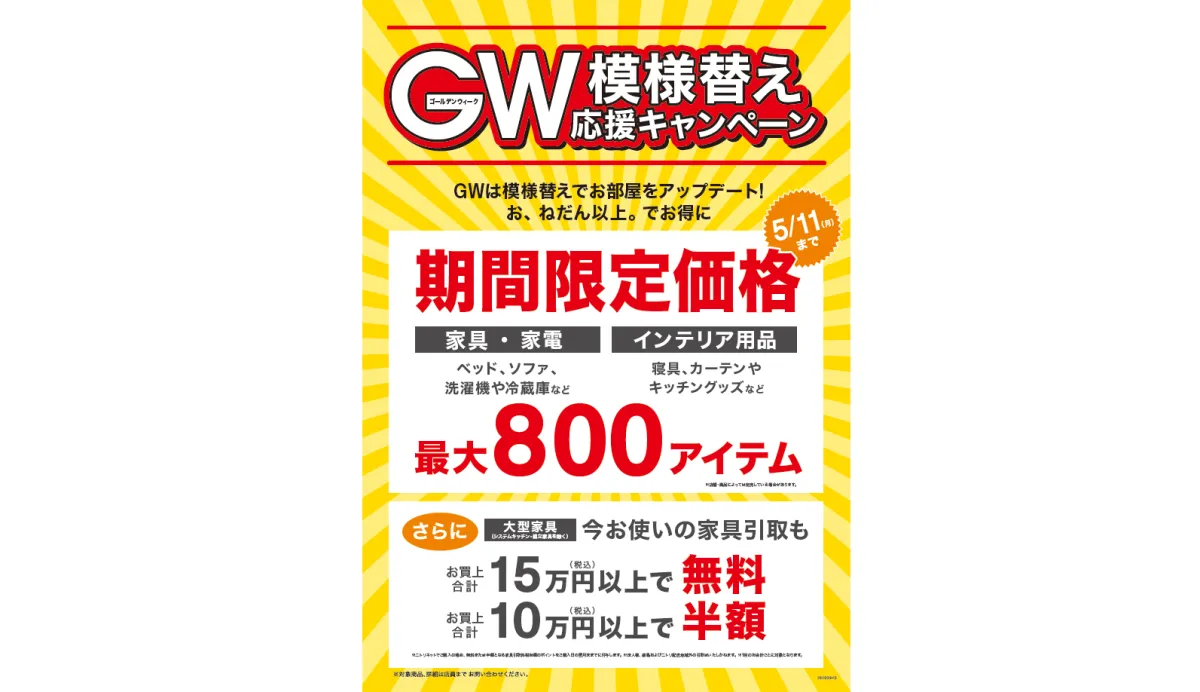 今回のキャンペーンでは、対象条件を満たすことで、家具の引取サービスが最大無料になります。具体的には、