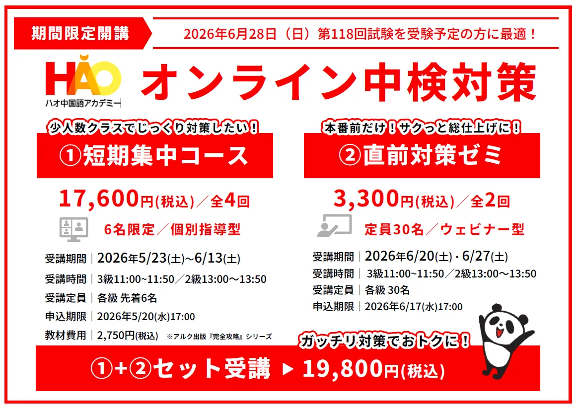 株式会社イーオンが運営するハオ中国語アカデミーでは、2026年6月に実施される中国語検定2級・3級に向けた短期集中コースおよび直前対策ゼミをオンラインで提供することが決定しました。今回はその詳細をお届けします。