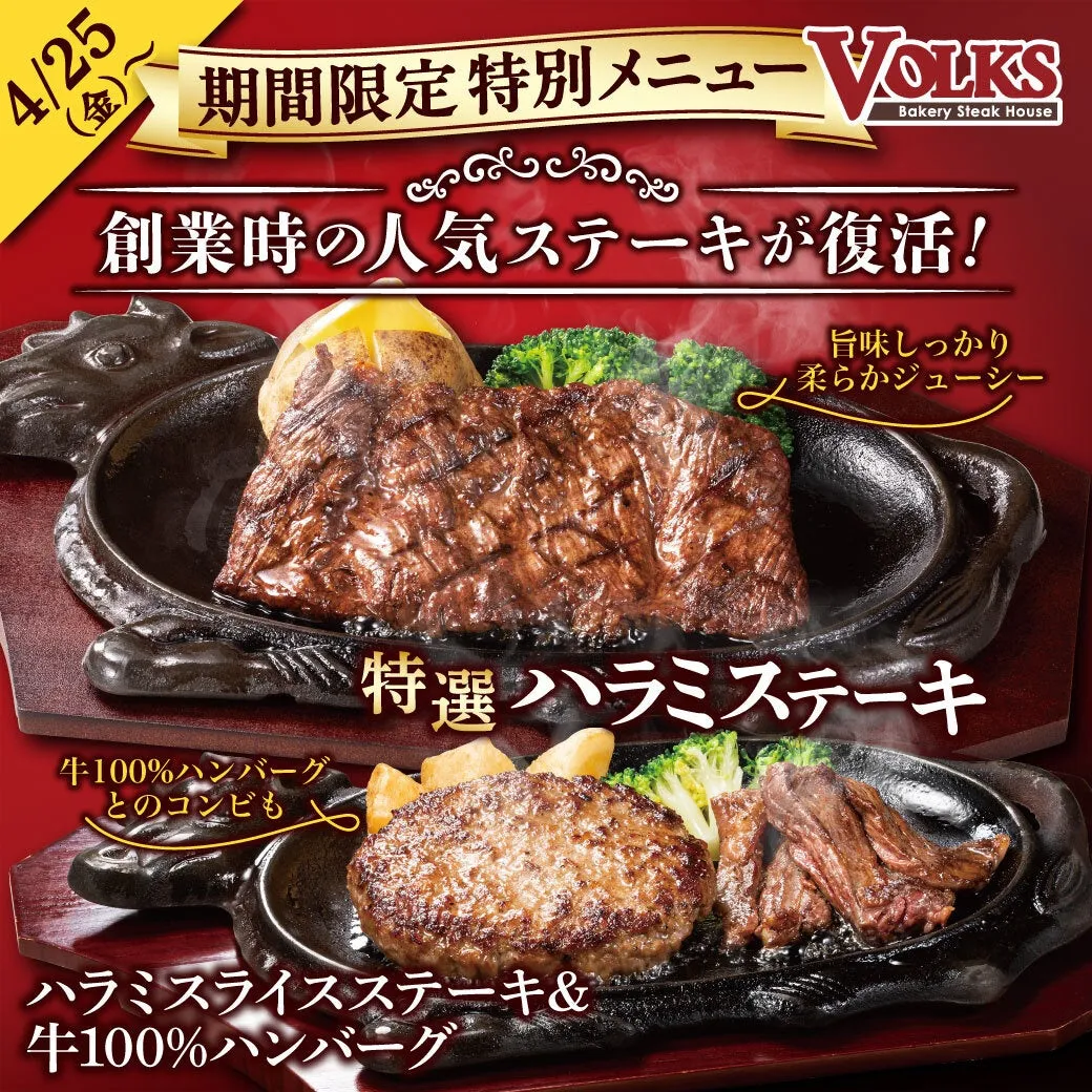 株式会社アークミールが運営するステーキハウスフォルクスが、GW期間限定で創業時から続く人気メニュー、特選ハラミステーキを復活させることを発表しました。これは、コストパフォーマンスに優れ、味も抜群のこのステーキを楽しめる絶好のチャンスです。