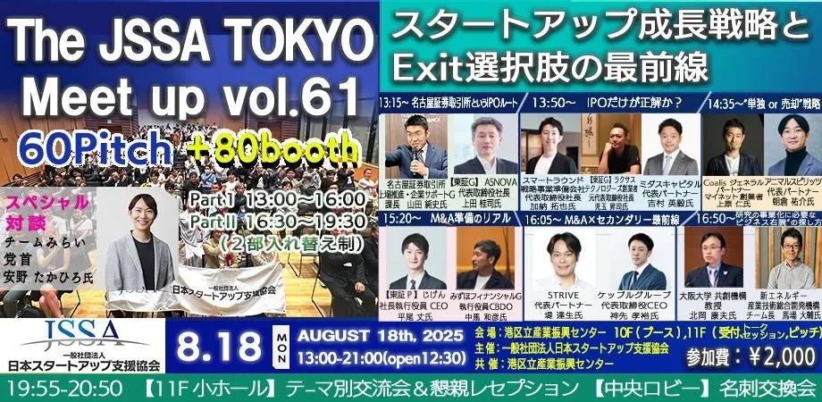 株式会社ギックスは、2025年8月18日(月)に東京都港区で開催される「THE JSSA TOKYO Meetup Vol.61」に参加します。このイベントは一般社団法人日本スタートアップ支援協会が主催し、M&AやIPO、セカンダリーマーケット、さらには大学発のスタートアップに焦点を当てた業界トピックを網羅するものです。