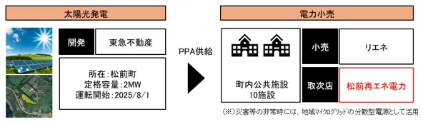 地域内の電力を供給する小売事業を行い、松前町の公共施設において太陽光発電から得られた電力の一部を供給します。将来的には、全家庭を対象に電力を提供し、地域内経済の循環を促進させる計画です。