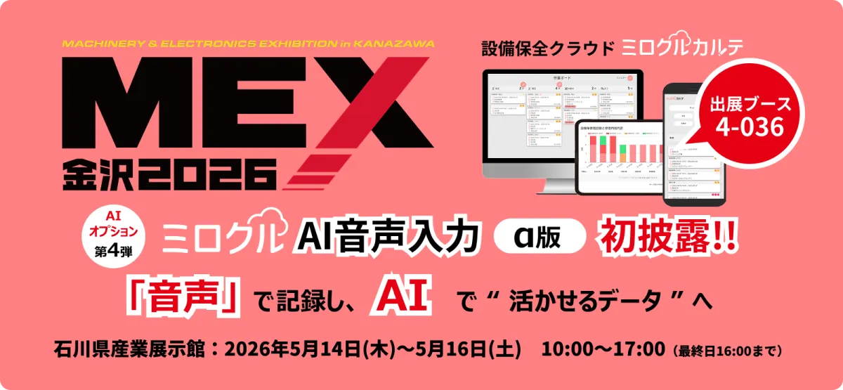 2026年5月に開催される「MEX金沢2026」で、設備保全クラウドサービス「ミロクルカルテ」が新たに「ミロクルAI音声入力(α版)」を初めて披露します。この新オプションは、作業現場での入力の手間を大幅に軽減し、誰でも同じ品質の記録を作成できるように設計されています。
