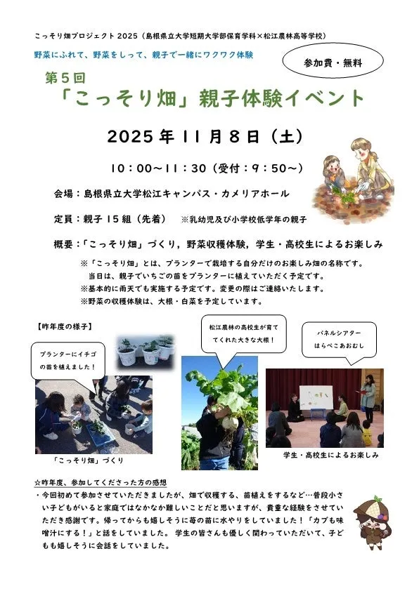 2025年11月8日(土)、島根県立大学の松江キャンパスにて「こっそり畑」と題した親子体験イベントが開催されます。このイベントは、農業を基盤とした自然体験活動である「こっそり畑プロジェクト」の一環として行われ、地域の学生たちと共に、親子で楽しむ貴重な機会を提供します。