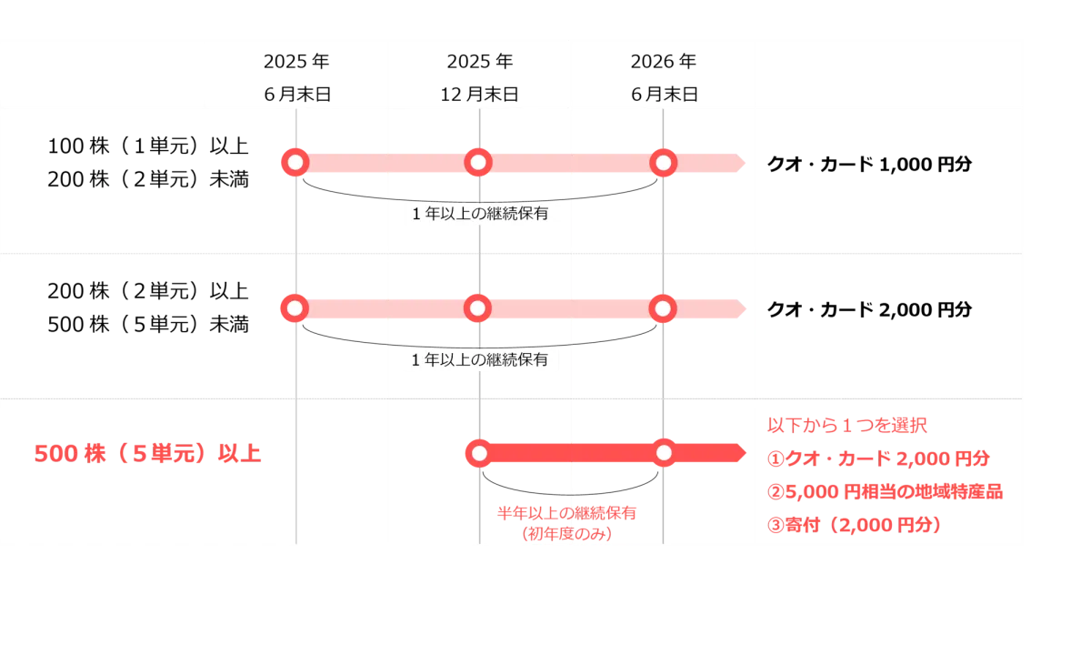 新たな制度を踏まえ、2027年6月末に優待品を受け取るためには、200株以上500株未満、もしくは500株以上の株式を保有する必要があります。これは、特に当社の取引を安定させるための重要な要素となっています。