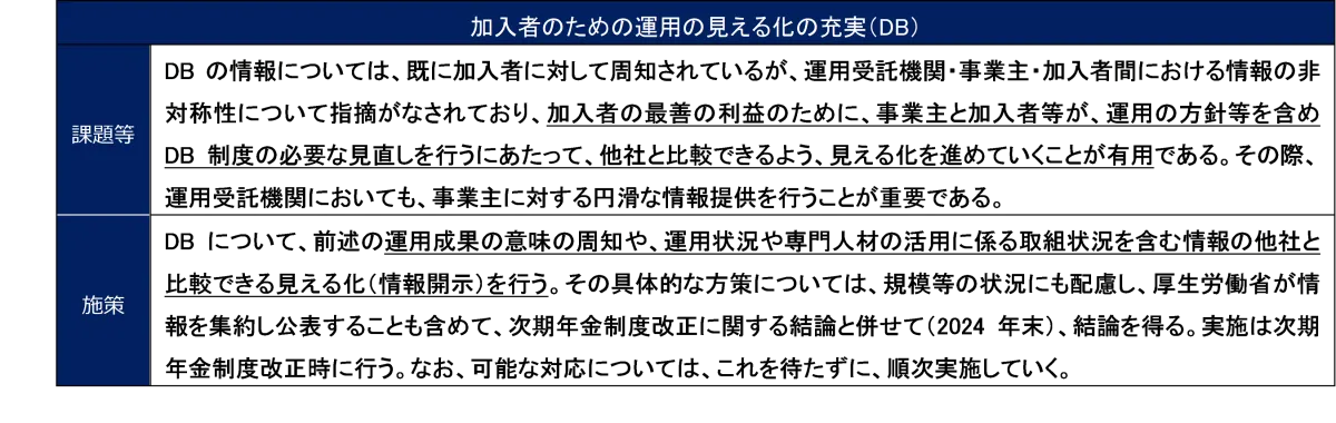 「見える化」を進めるためには、情報を適切に整理して、理解しやすい形式で提供することが求められます。利用者の視点に立った情報提供が、制度の透明性を高める鍵となります。企業年金の透明性が高まることによって、加入者の不安を解消し、より多くの人々が安心して利用できるようになります。