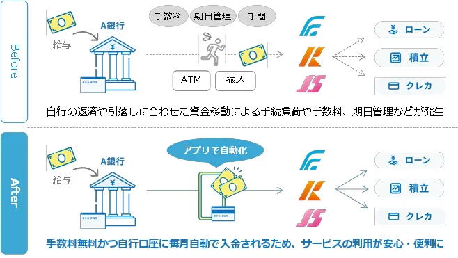 本サービスは、利用者が他行にある自分名義の口座から、月々指定した金額を自動的に引き落とし、指定の銀行口座に移動するものです。これまでのように、ATMでの入金や他行からの振込を行う必要がなくなり、手続きの負担を大きく軽減します。また、入金のタイミングを失念する心配もなくなります。