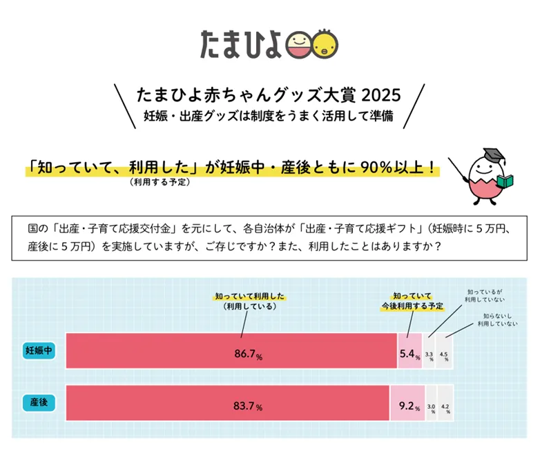 近年、特に注目されているのは、自治体による「出産・子育て応援ギフト」の利用状況です。調査によると、妊娠中又は産後にこのギフトを「知っていて、利用した」もしくは「知っていて、今後利用する予定」と答えた人は90%以上に及びました。このギフトは、国が出した「出産・子育て応援交付金」をもとに各自治体が独自に支援策を展開し、地域のニーズに合わせたさまざまな支援があることが特徴です。