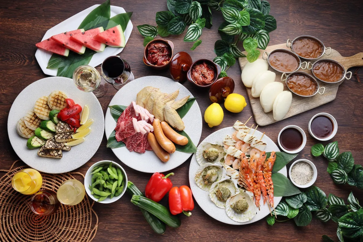 「屋上アウトドアバーベキュー星」では、様々なメニューが用意されています。特におすすめは、9,500円のBBQプラン。内容は、スモークサーモンのミックスサラダから、国産牛のステーキ、黒鶏手羽先、壺漬け肩ロースなどの肉料理がふんだんに盛り込まれています。また、海鮮も堪能できるホタテ香草バター焼きや、有頭海老ブロシェットも楽しめます。さらに、向かいには美しいびわ湖を眺めながらリラックスできるカウンター席も用意されています。