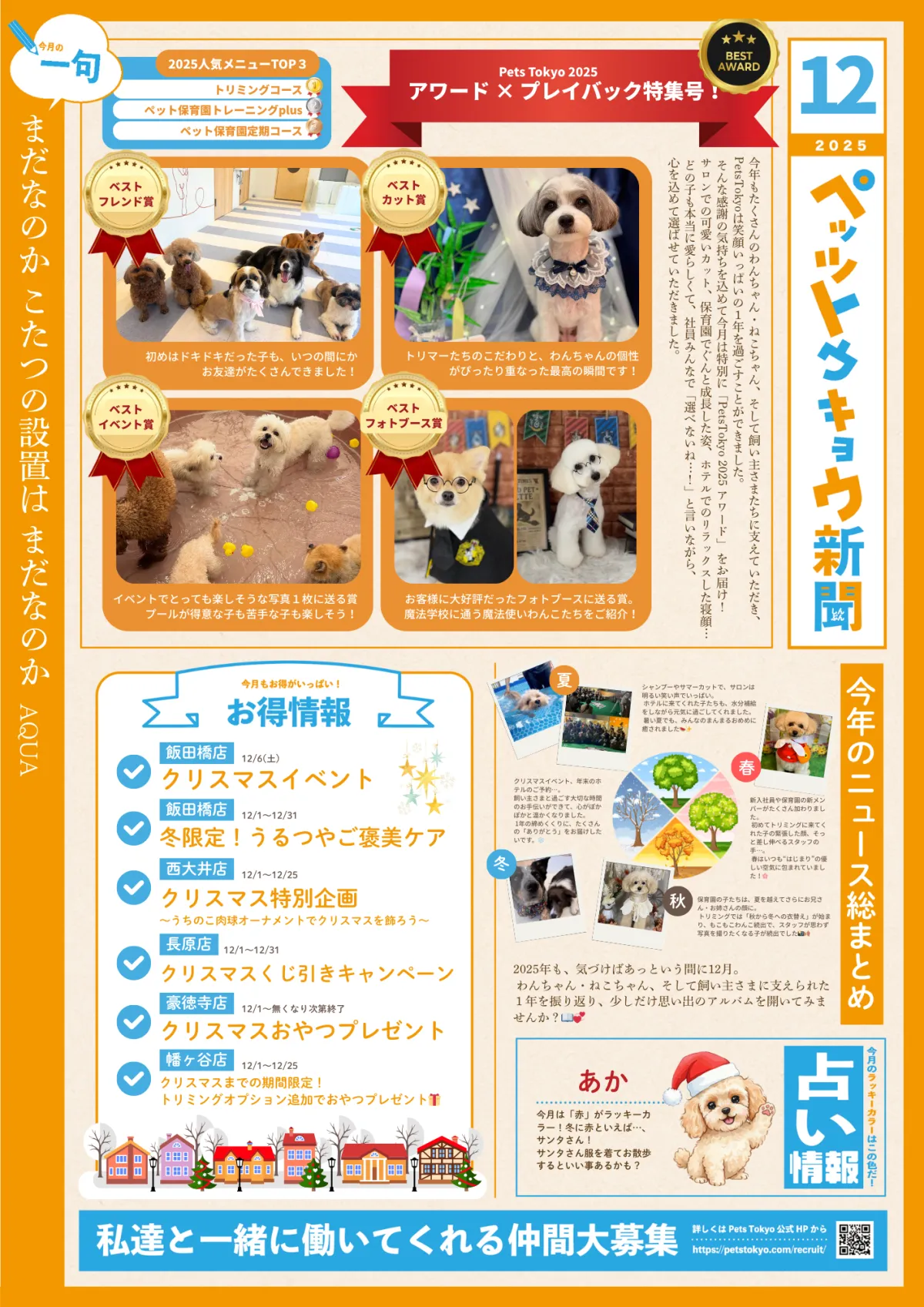 Pets Tokyo株式会社が贈る「ペッツトウキョウ新聞」の12月号がついに発行されました。このフリーペーパーは、ペットとその飼い主に向けて、毎日の生活をより豊かにする情報を提供しています。本号の特集では、2025年の出来事を振り返る「年間プレイバック」と2025年度の優れた業績を称える「PetsTokyo Award 2025」が紹介されています。