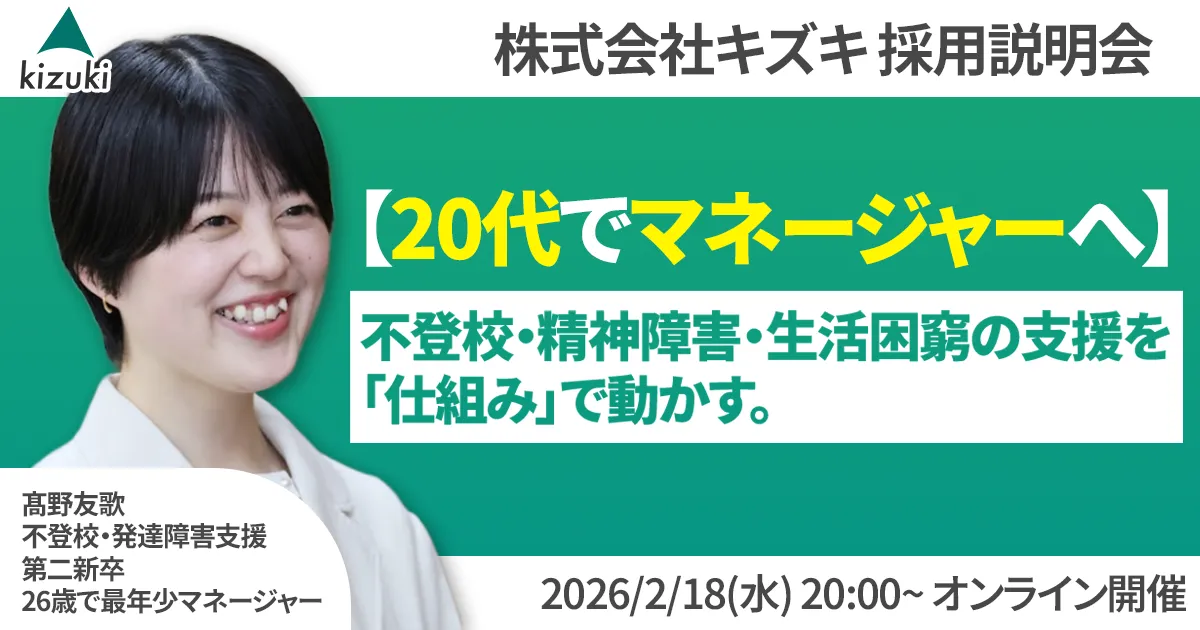 キズキでは、年功序列が一切なく、努力や成果が評価に直結します。20代でも責任あるポジションを担うことができ、マネージャーとして昇進するチャンスが豊富にあります。支援という重要な仕事を通じて、専門性を高め、数値や成果に基づく成長を実感することができます。「何度でもやり直せる社会」に共感し、自らの成長を望む方には最適な環境です。