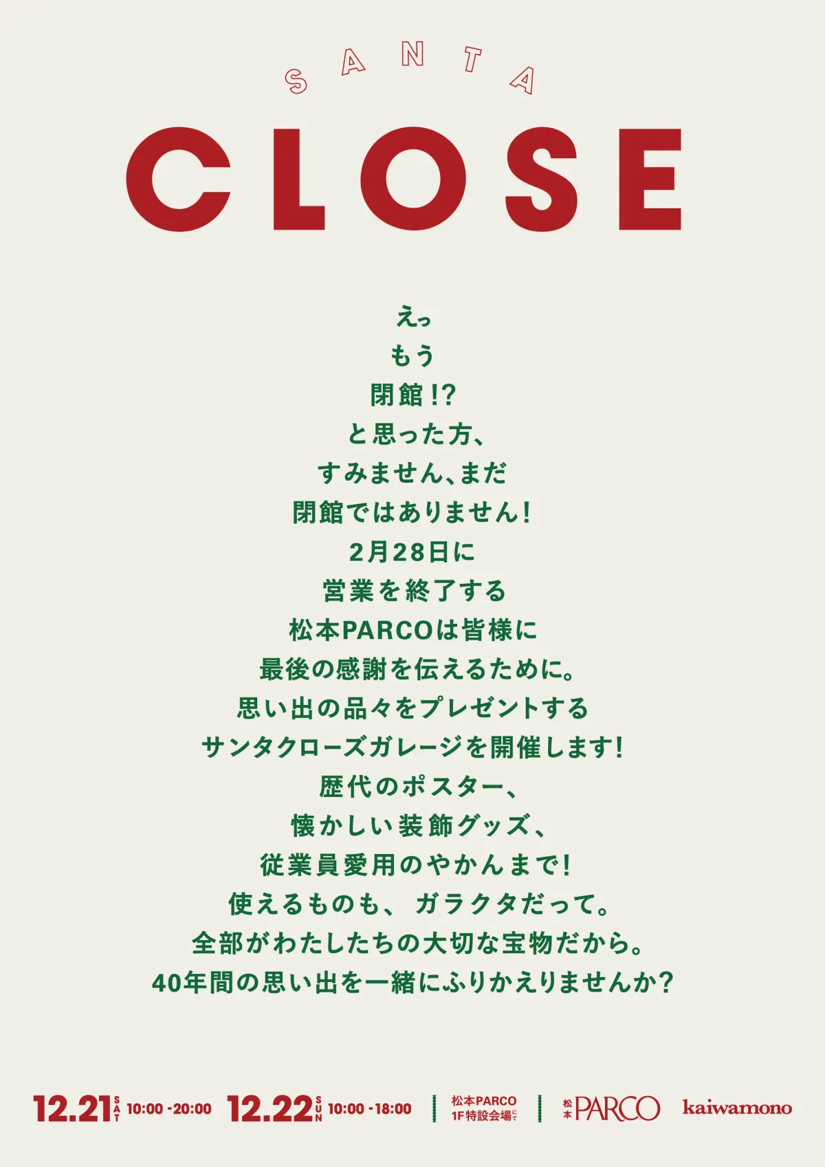 長野県松本市に位置する松本PARCOが、地元出身のクリエイティブチーム“kaiwamono”とコラボレーションし、「SANTA CLOSE GARAGE」という特別なイベントを開催します。このイベントは、松本PARCOの閉館前の最後のクリスマスを飾るもので、12月21日(土)・22日(日)の2日間にわたり実施されます。