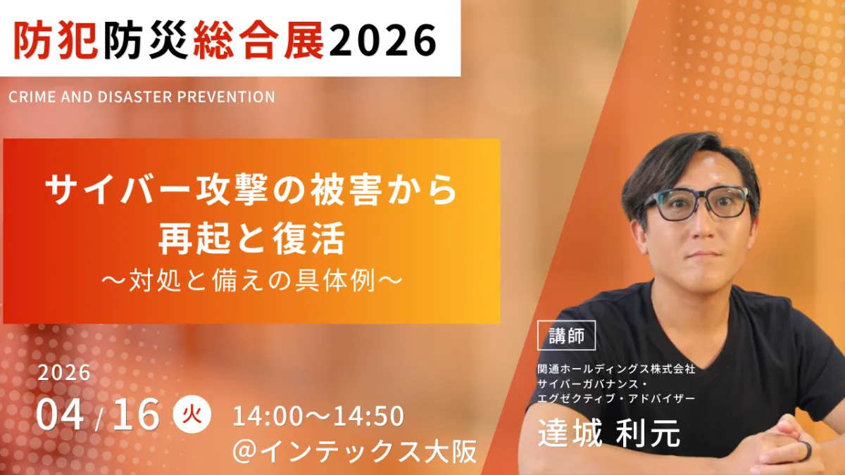 2026年4月16日、大阪のインテックスで行われる「防犯防災総合展2026」において、関通ホールディングス株式会社のサイバーガバナンス・エグゼクティブ・アドバイザー、達城利元氏がセミナーを行います。このイベントは、4月15日から17日の3日間にわたり開催され、西日本最大の安全と安心をテーマにした専門展示会です。