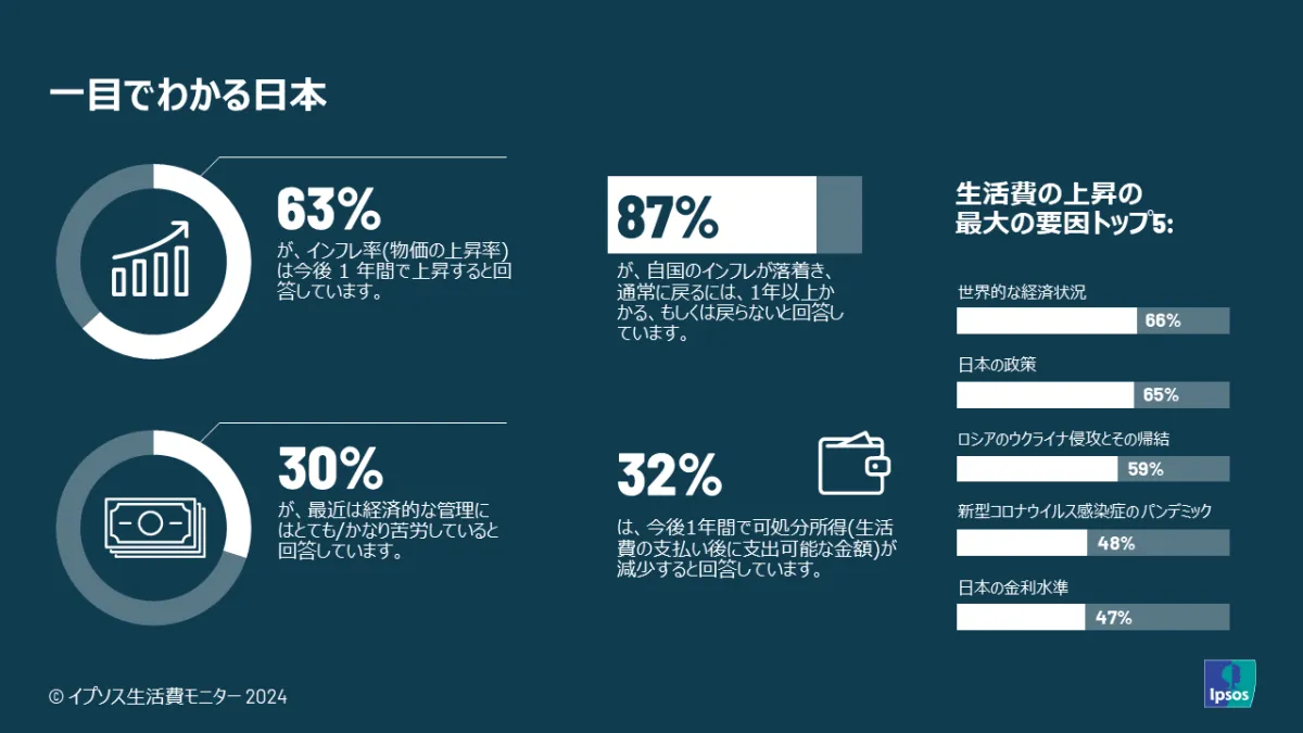 世界最大規模の世論調査会社、イプソスが発表した2024年度の生活費モニターによると、日本人のインフレに対する見解が他国と比べて特に悲観的であることが明らかになりました。この調査は32か国を対象にしたもので、日本の結果はその中でも際立っています。