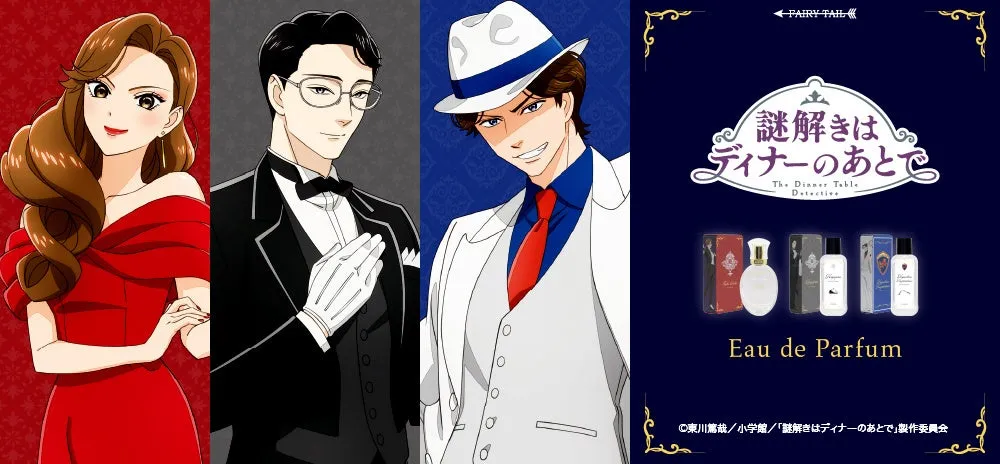 人気TVアニメ『謎解きはディナーのあとで』のキャラクターをテーマにした香水が、フェアリーテイル株式会社から12月19日(金)に発売されます。オンラインストア「DREAMING PRINCESS」や、Amazon、楽天市場の「フレグランスファンタジー」にて入手可能です。キャラクターは、「宝生麗子」「影山」「風祭京一郎」の3名で、それぞれ異なる香りの世界を演出しています。