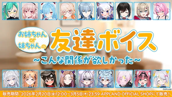 2026年2月20日(金)、株式会社アップランドが運営する「.LIVE」や「ぶいぱい」の人気VTuberたちが、待望のボイスコンテンツ『お姉ちゃんor妹ちゃんの友達ボイス~こんな関係が欲しかった~』をリリースします。この作品は、姉妹ではなく友達としての関係をテーマにしており、思わず甘えたくなるようなシチュエーションを楽しむことができます。
