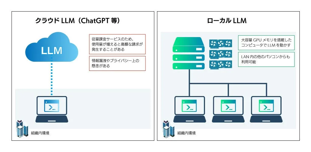 ChatGPTの登場以降、ローカルLLMを利用したいという声が増えています。特に、自社内でのデータ管理やプライバシー、そしてセキュリティを重視する企業にとって、ローカルLLMは魅力的な選択肢となっています。クラウド型のサービスに比べ、ローカルLLMは従量課金が発生せず、情報漏洩のリスクがないため、機密性の高い情報を扱う場合にも最適です。