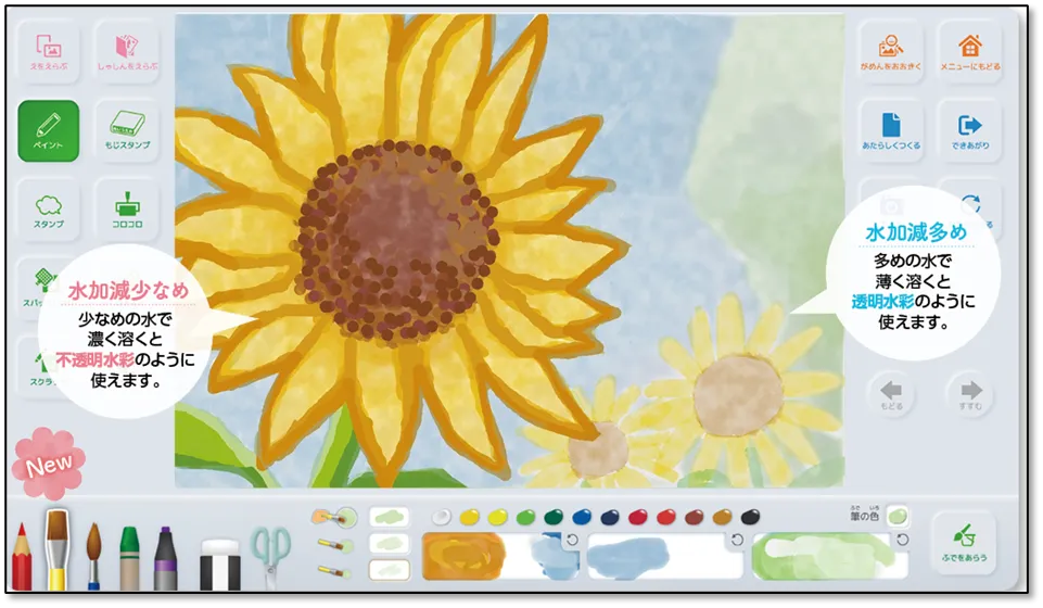 「ピクチャーキッズクラウド」が搭載する「半透明水彩調」は、子どもたちの多様な表現を可能にするために開発された機能です。従来の「アクリル調」に加えて、学童用の絵の具の質感を再現しました。これにより、子どもたちは溶かす水の量を調整することで、透明感のある表現から不透明な色合いまで自由に描くことができます。