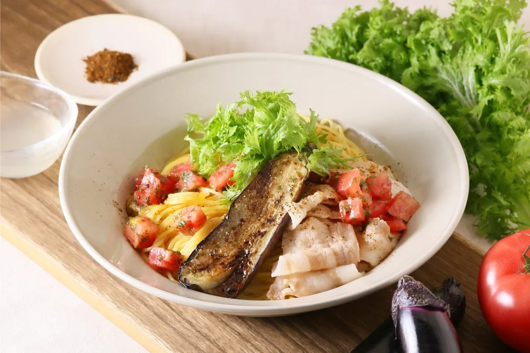 まずご紹介するのは、塩ポン酢の香りが引き立つ、「夏野菜と豚しゃぶの和パスタ」。この一皿は焼きなすの香ばしさや、大葉風味のトマトマリネが楽しめる、まさに夏の恵みを詰め込んだ料理です。柔らかい豚しゃぶ肉は、塩ぽん酢と出汁のコンビネーションによってさっぱりとした味わいに仕上げられています。仕上げには、わさび菜と山椒のオリジナルスパイスが用いられ、ほんのりとしたアクセントを添えています。この季節のパスタは、まさに夏のエネルギーをもたらしてくれる一皿です。